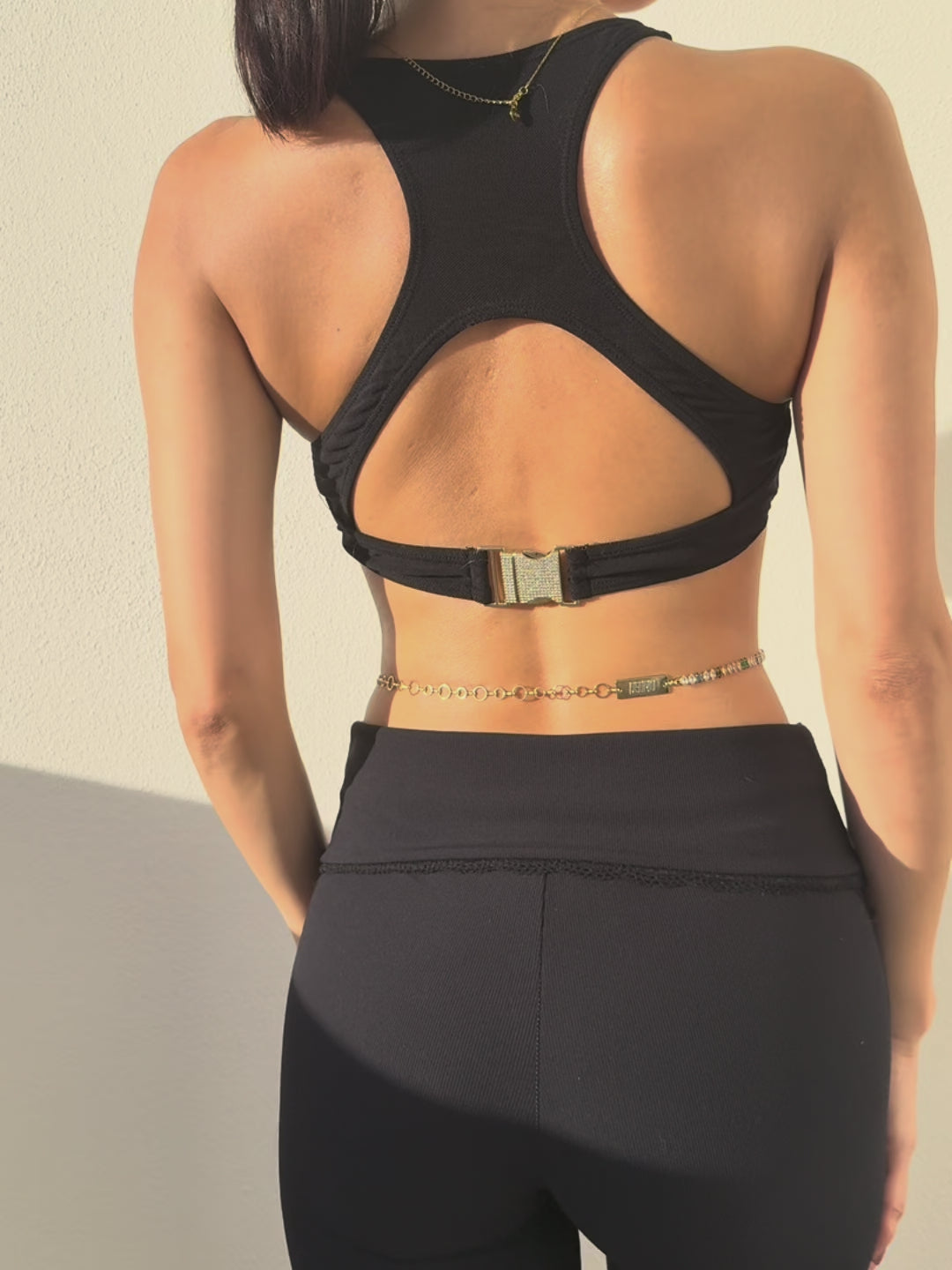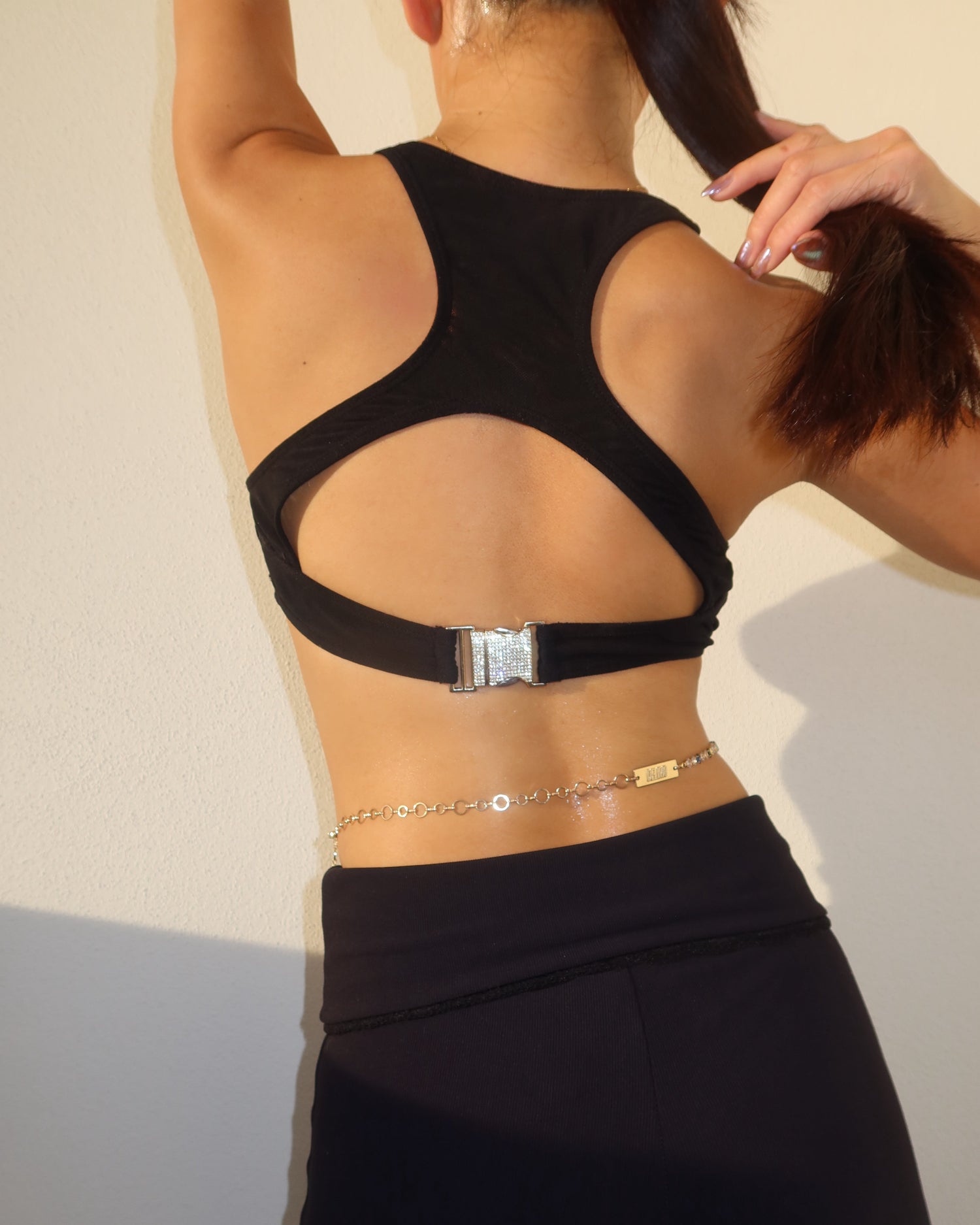 A sporty-meets-sexy essential, this scoop-neck mesh racerback bralette gives you breathable comfort with a sleek, sculpted fit. The soft mesh feels like activewear, while the crystal-embellished buckle turns it into a statement piece made for nights out. The racerback offers secure support and freedom to move — perfect for dancing, training, or styling under your favourite party fits.