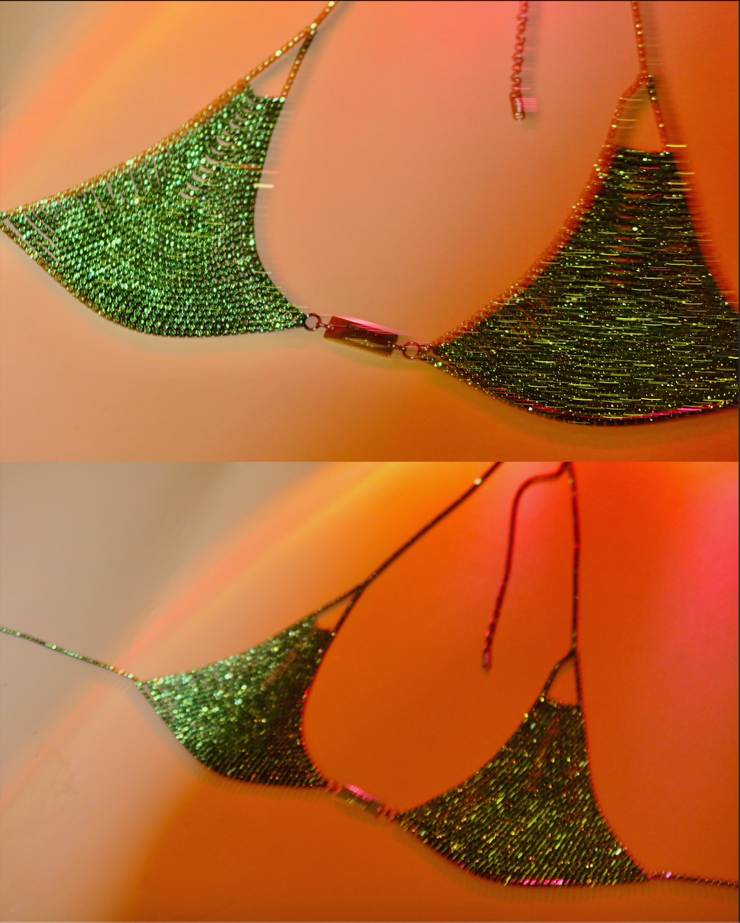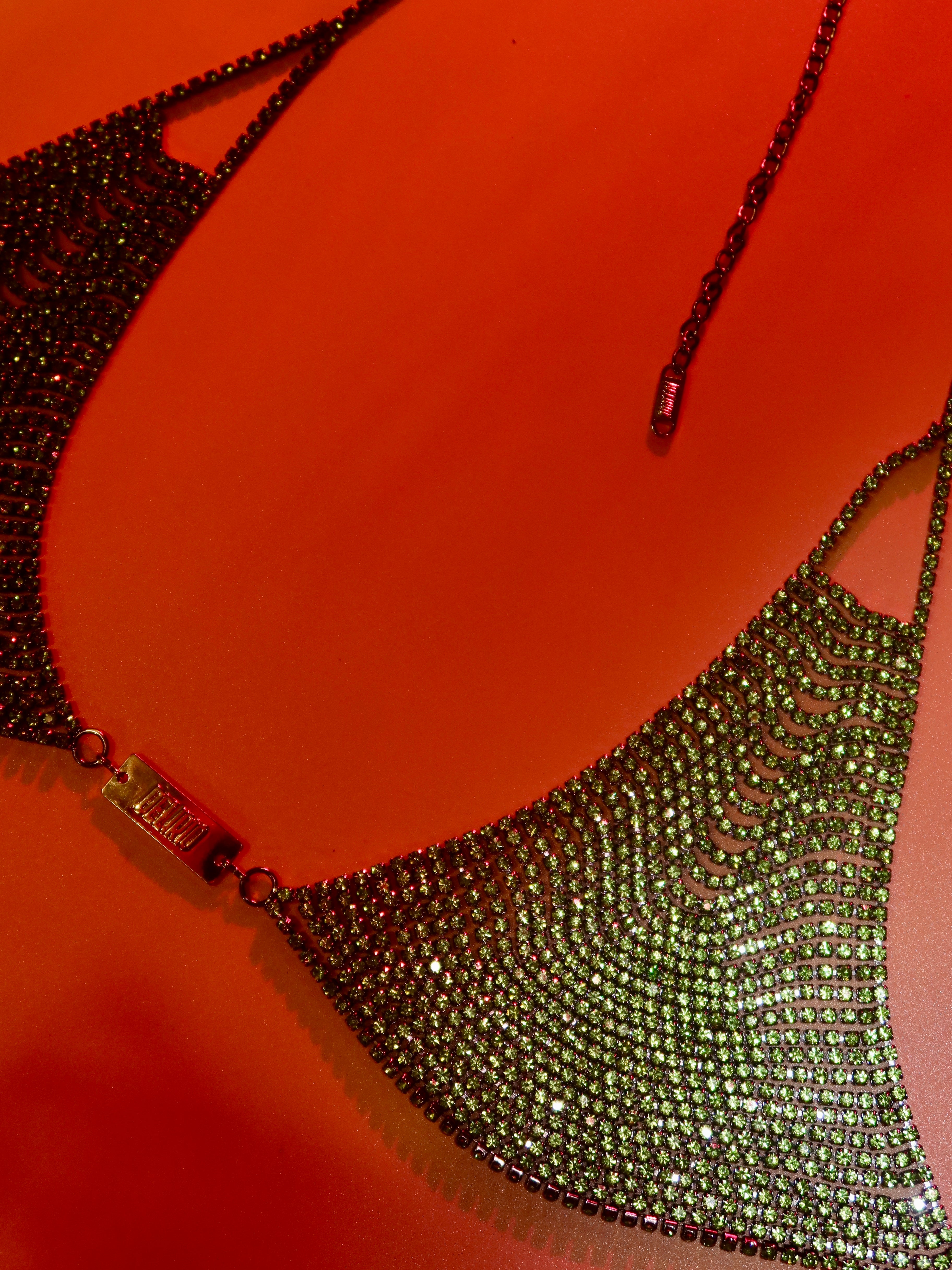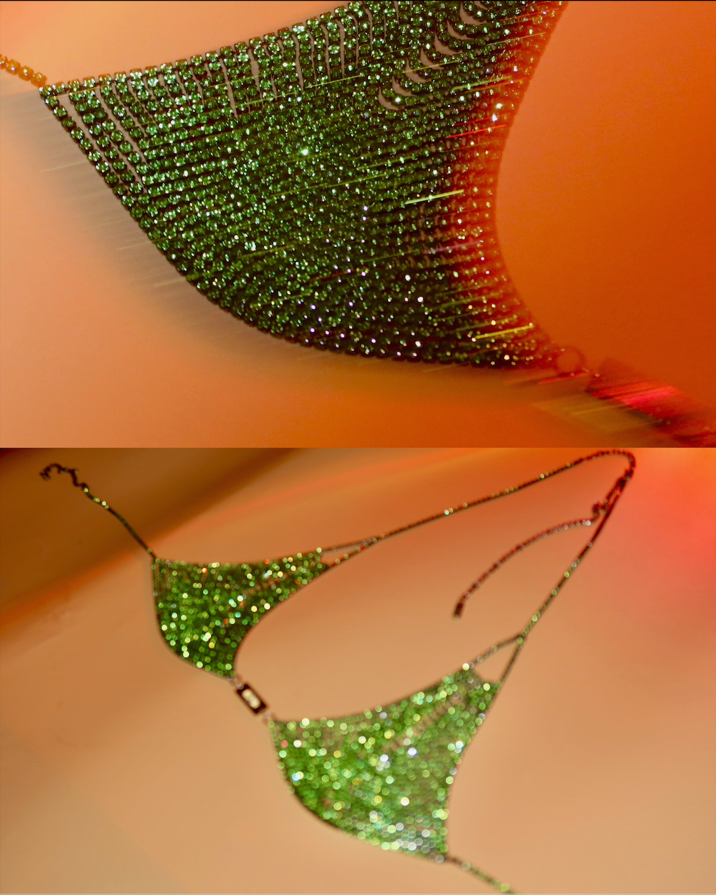 The Gaia Crystal Chain Top is a full-glam statement piece designed to steal every spotlight. Crafted entirely from sparkling crystal chains, it drapes over your body with a luxe, body-jewelry feel while catching every flash and movement. The open-back, fluid silhouette gives you that bold, goddess-level shine — perfect for festivals, club nights, photoshoots, or layering over bikinis and bralettes.