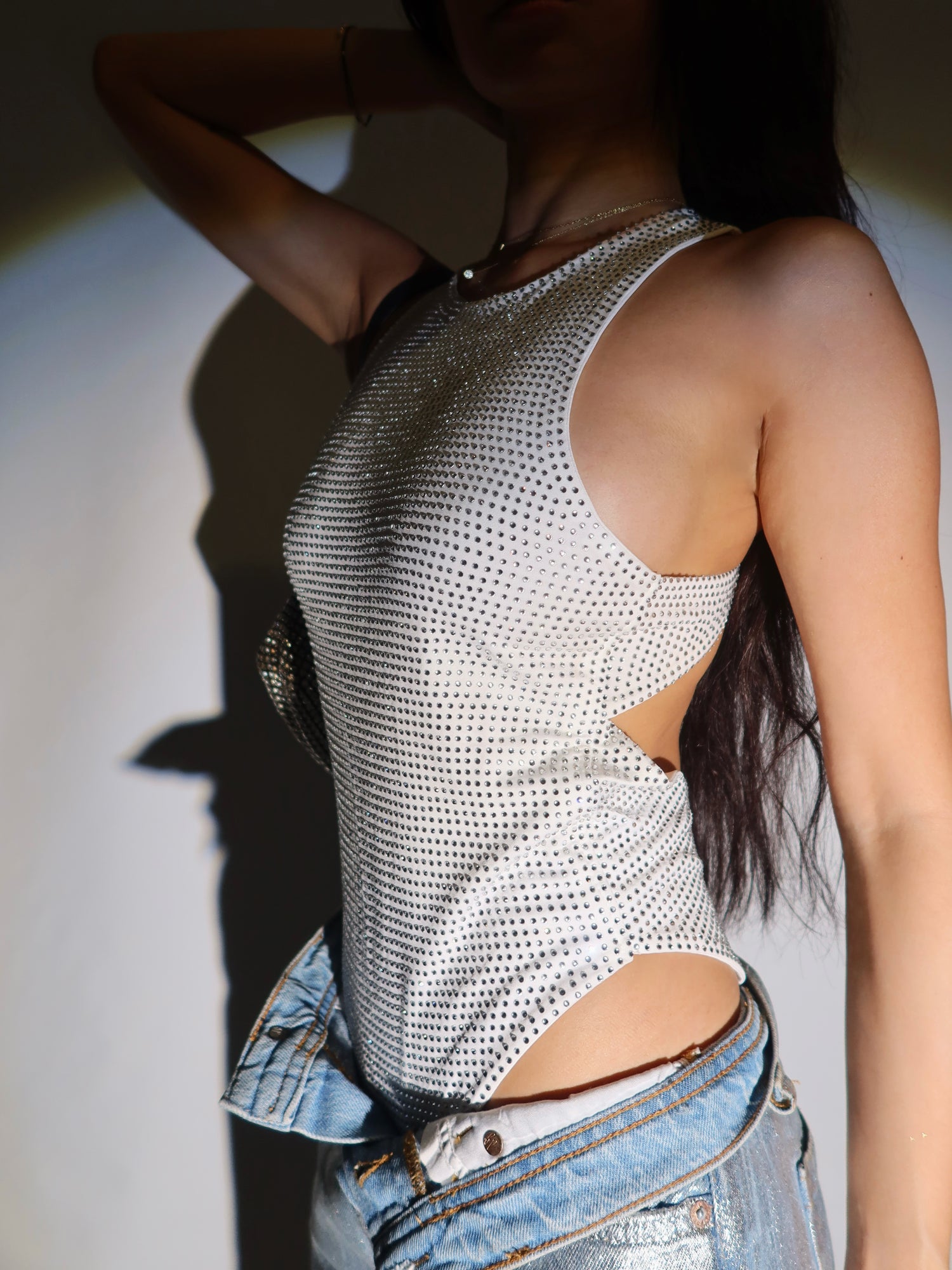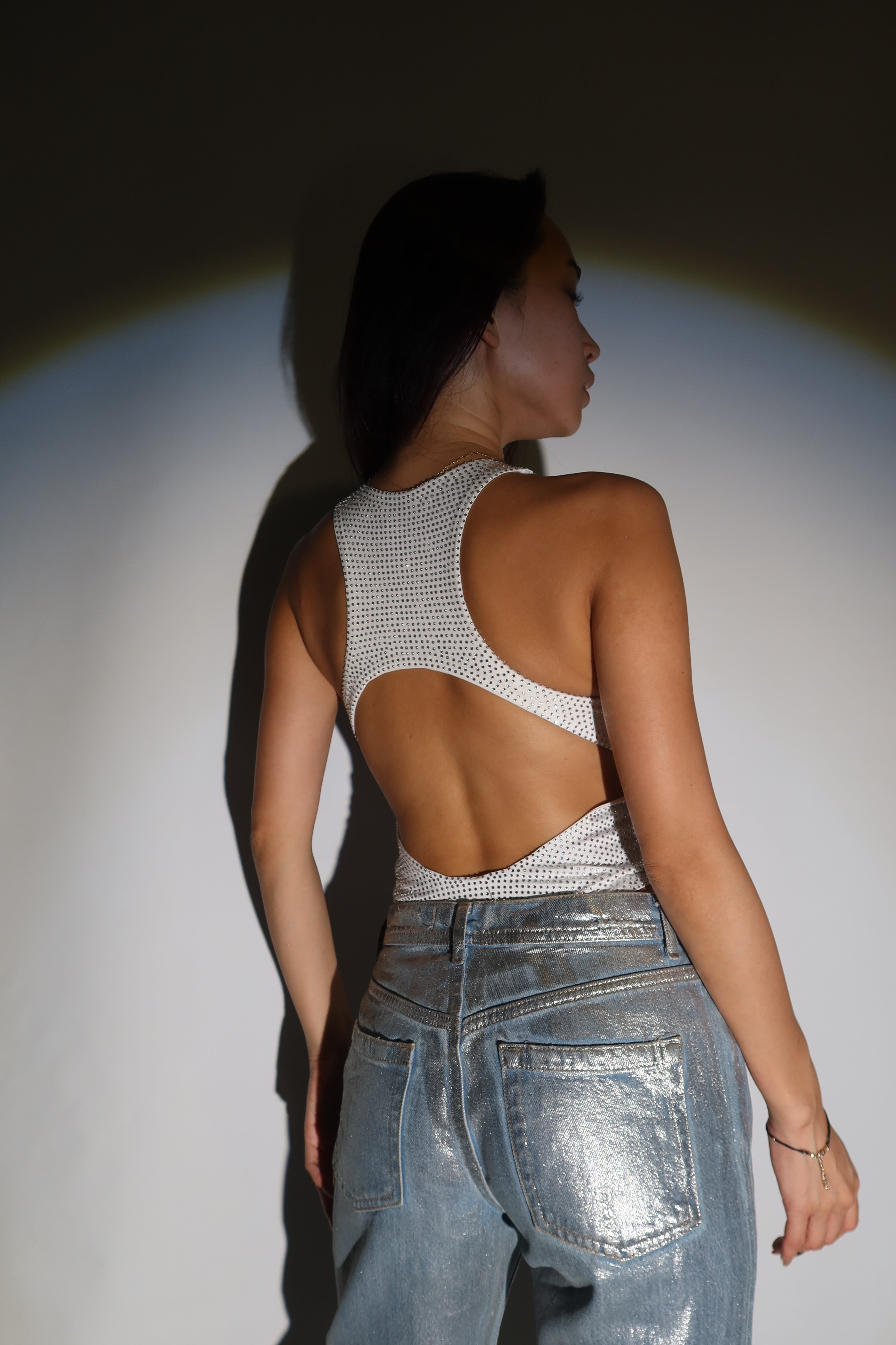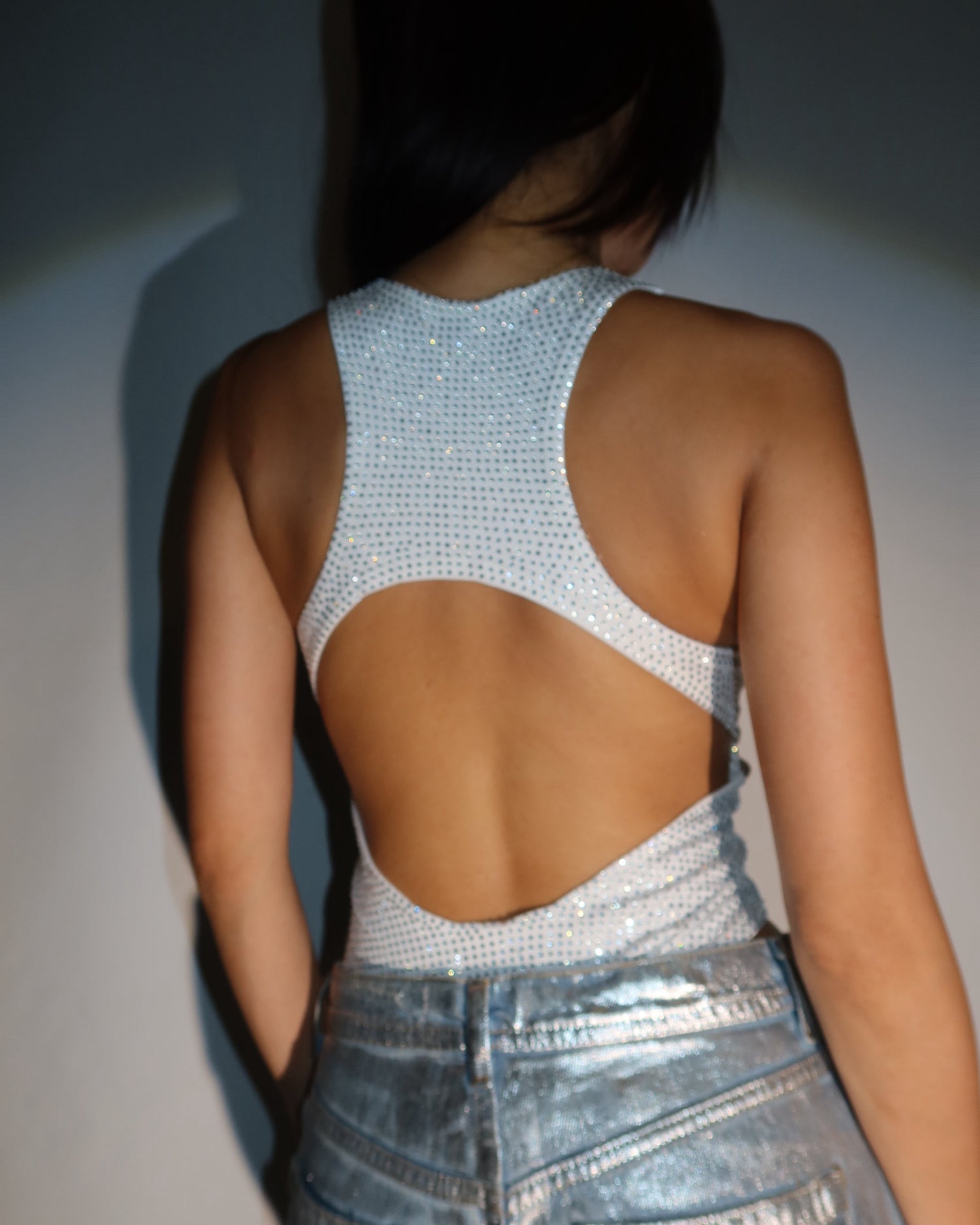 HALO turns clean lines into maximum shimmer with all-over white crystals on a soft, stretchy base that hugs comfortably from daybed to dance floor.